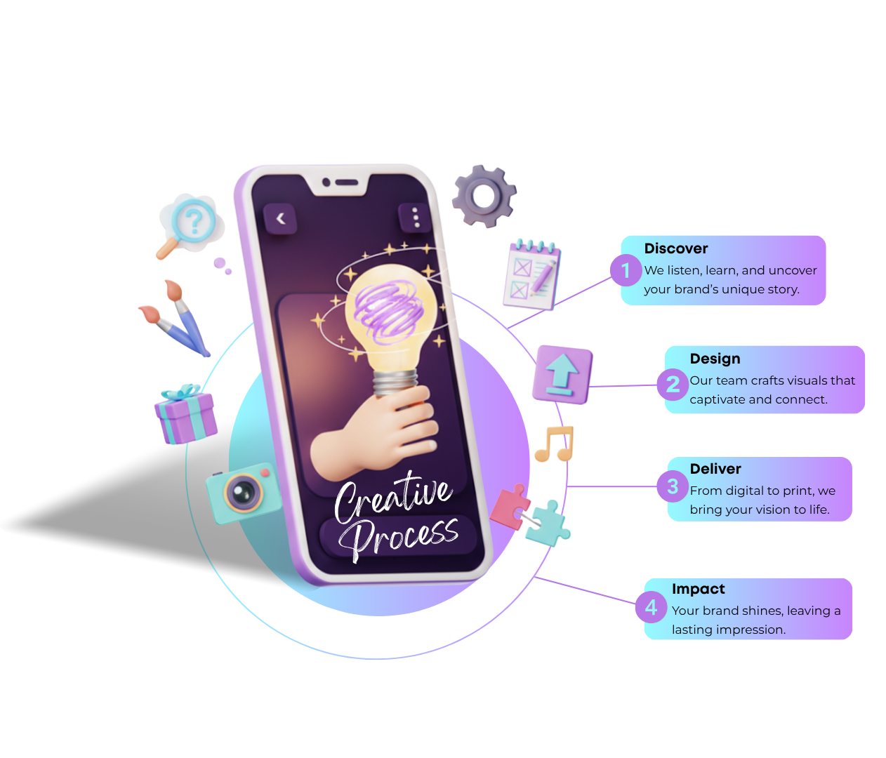 We follow four steps: Discover, Design, Deliver, Impact. You’ll see your brand come to life with clarity and purpose at every stage.